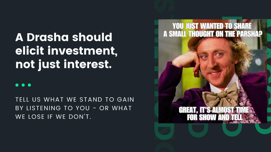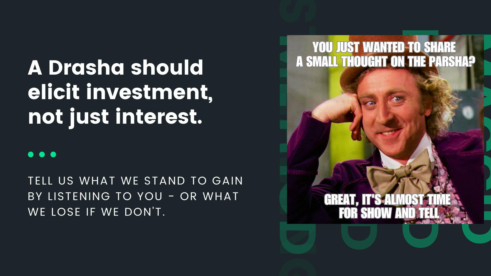 When you get up and share a Dvar Torah that doesn’t deal directly with any of the things they’re going through in their own lives...And ask them to pay attention to you passively while you talk, where do you think their minds are going to go?Unless you’re entertaining them, which at least serves to distract them from their real life issues, they’re not going to be able to pay attention to you for more than a moment or two, before their mind goes back to thinking about what’s going on in their own lives.