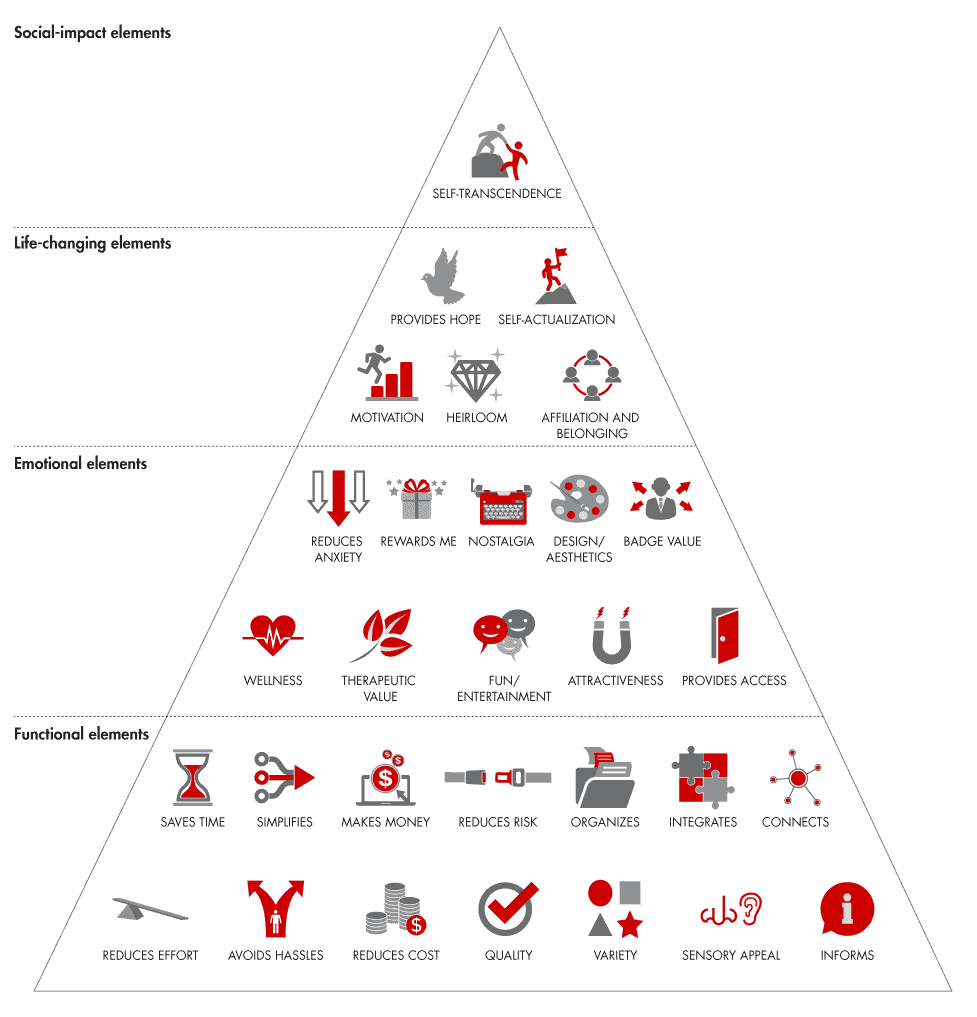 The Value PyramidThe below graphic is a hierarchy of value offerings, as defined by the marketplace. The higher up on the pyramid, the more people are willing to pay for that value.